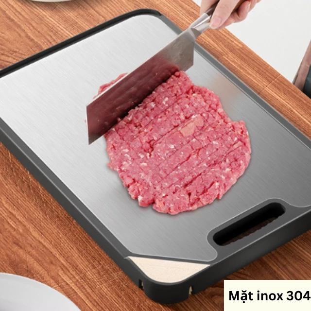 ☑️ Thớt có 2 mặt chất liệu tạo Inox304 + Nhựa PP dày dặn chịu lực tốt.