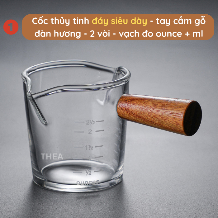 Cốc ly thủy tinh đong 100ml mini chịu nhiệt chia vạch đến 75ml 2 vòi dùng pha chế cà phê, sữa, sốt chấm có tay cầm bằng gỗ tiện dụng,