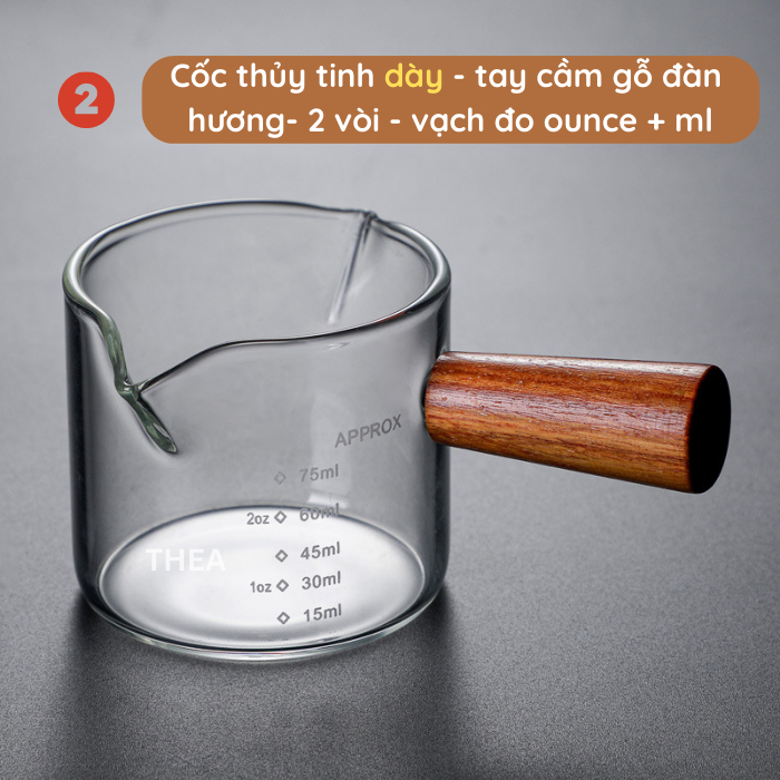 Tên sản phẩm: Cốc thủy tinh đong ml mini chịu nhiệt chia vạch đến 75ml pha chế cà phê, sữa, sốt chấm có tay cầm bằng gỗ tiện dụng, nhỏ xinh