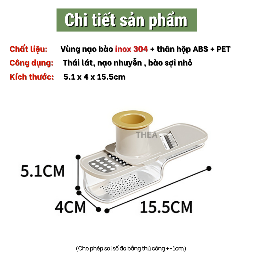 - Công Dụng: Cắt lát mỏng, nạo sợi, bào nhuyễn hoặc tỉa thực phẩm như gừng, tỏi, khoai sọc mỏng, riềng và nhiều loại củ quả nhỏ khác.