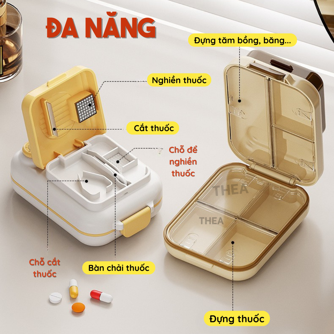 - Công dụng: đựng và phân loại thuốc hàng ngày, cắt nghiền thuốc khi cần. Dễ dàng lấy thuốc đúng liều và ngăn ngừa thất lạc.