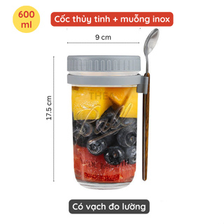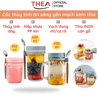 Cốc ly thủy tinh ăn ngũ cốc ăn sáng, đựng gia vị, đựng mứt có nắp, có vạch chia kèm muỗng inox cán gỗ sang trọng - THEA
