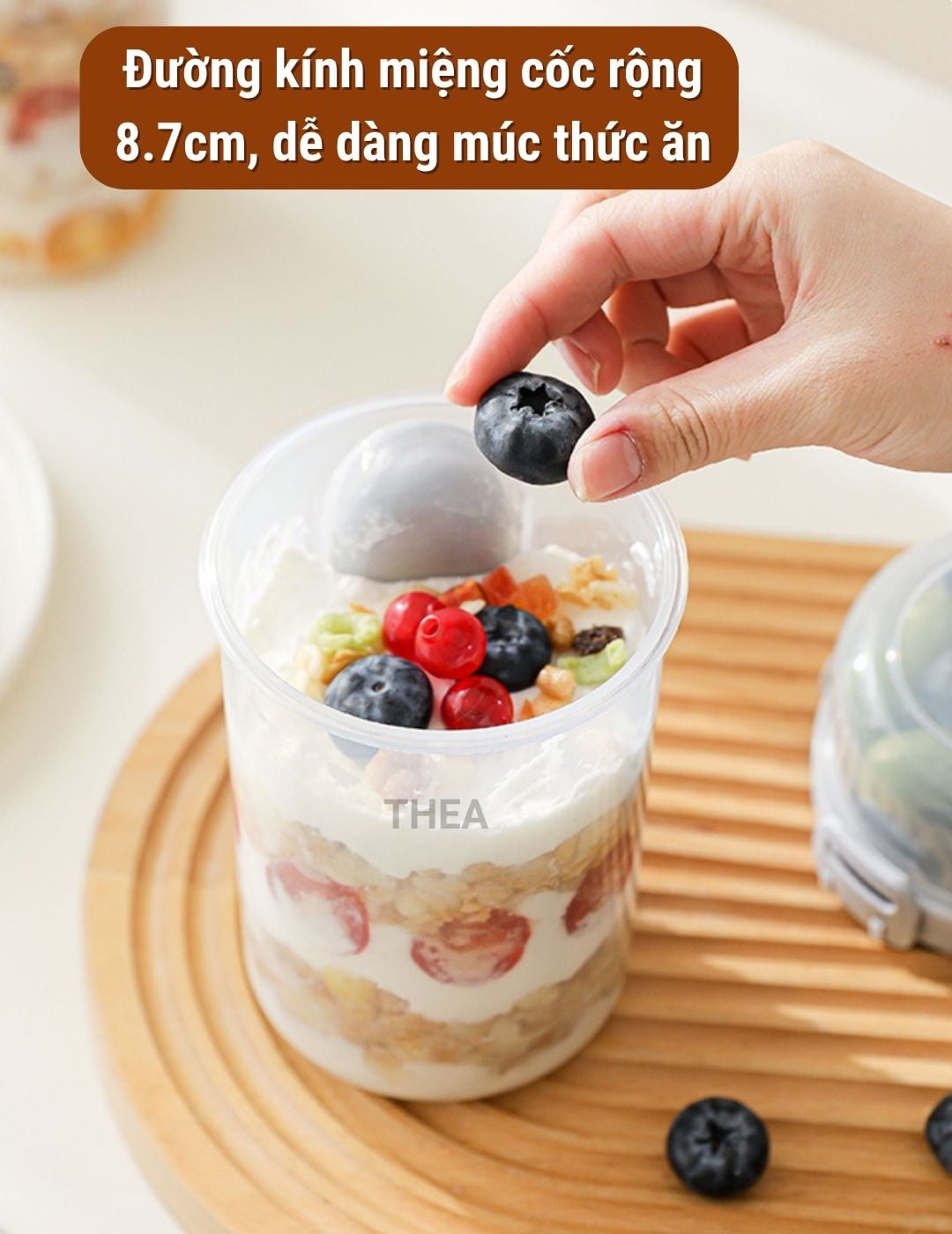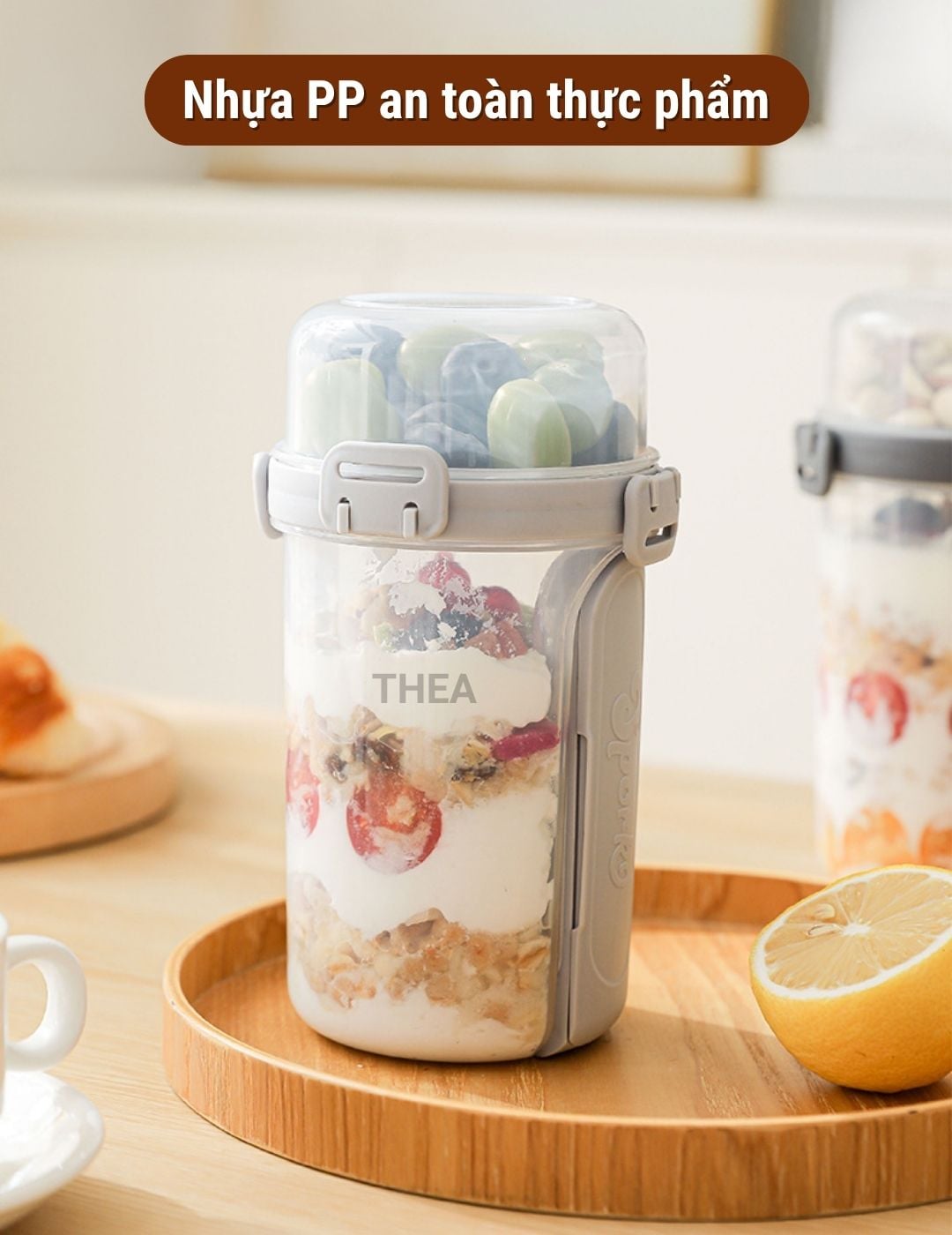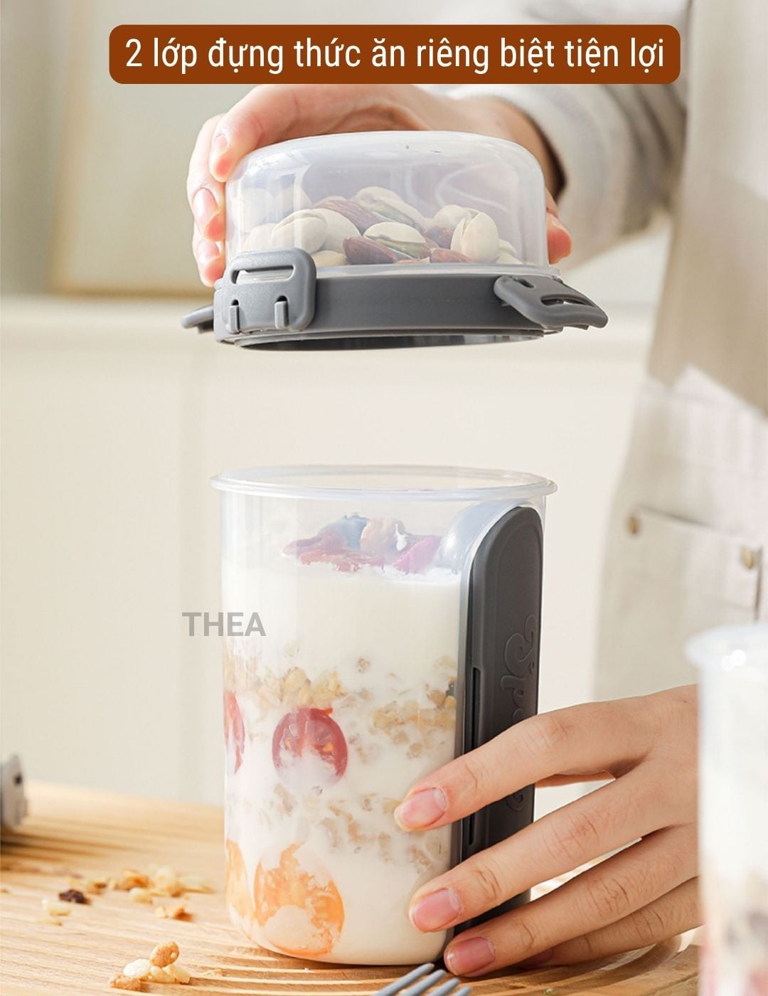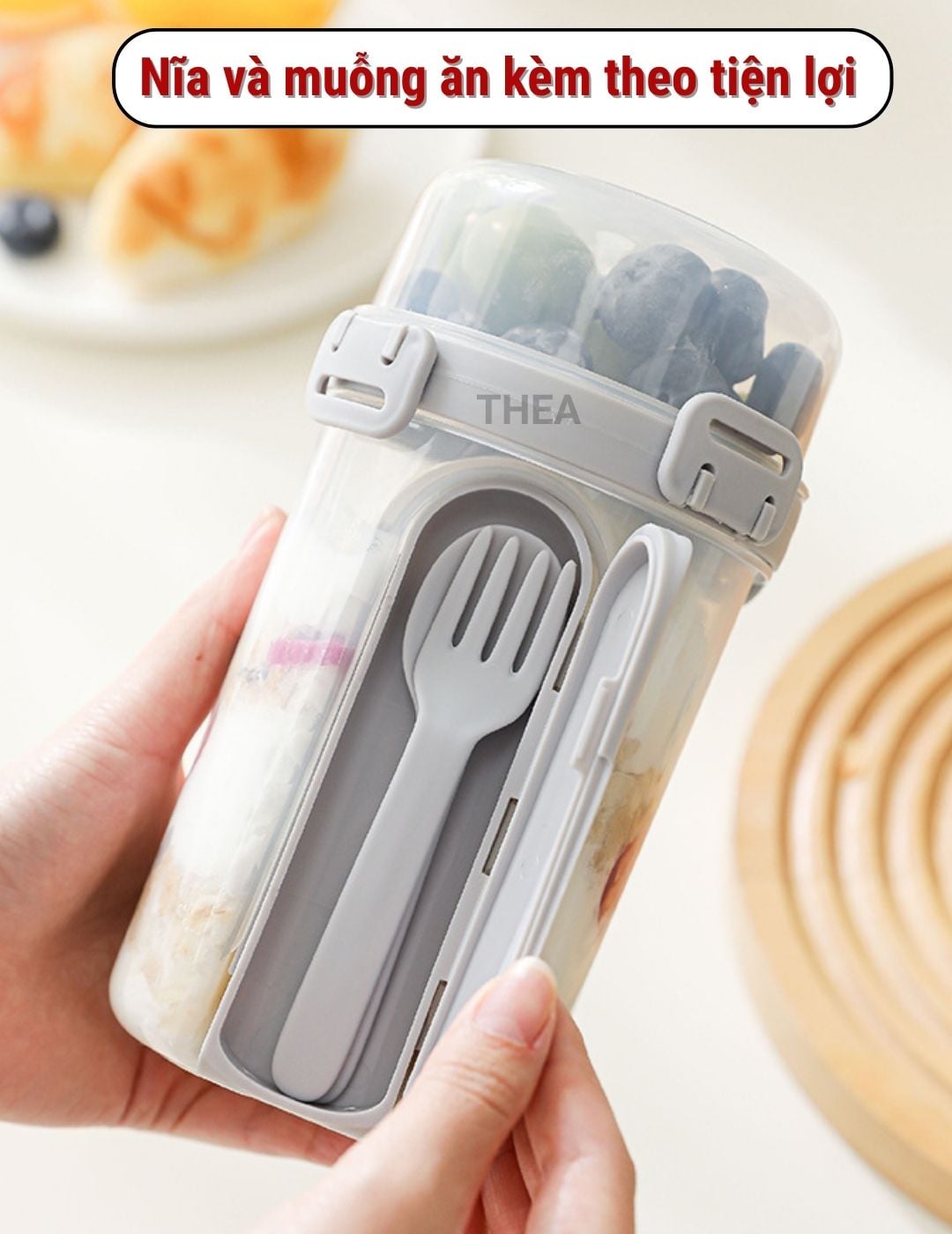 Hũ đựng yến mạch qua đêm, cốc nhựa trong có nắp ngâm yến mạch, Hộp đựng salad, hạt, ngũ cốc ăn sáng kèm muỗng nĩa 2 tầng - THEA