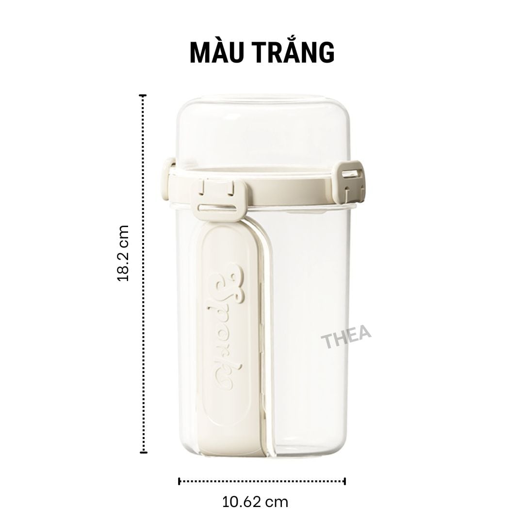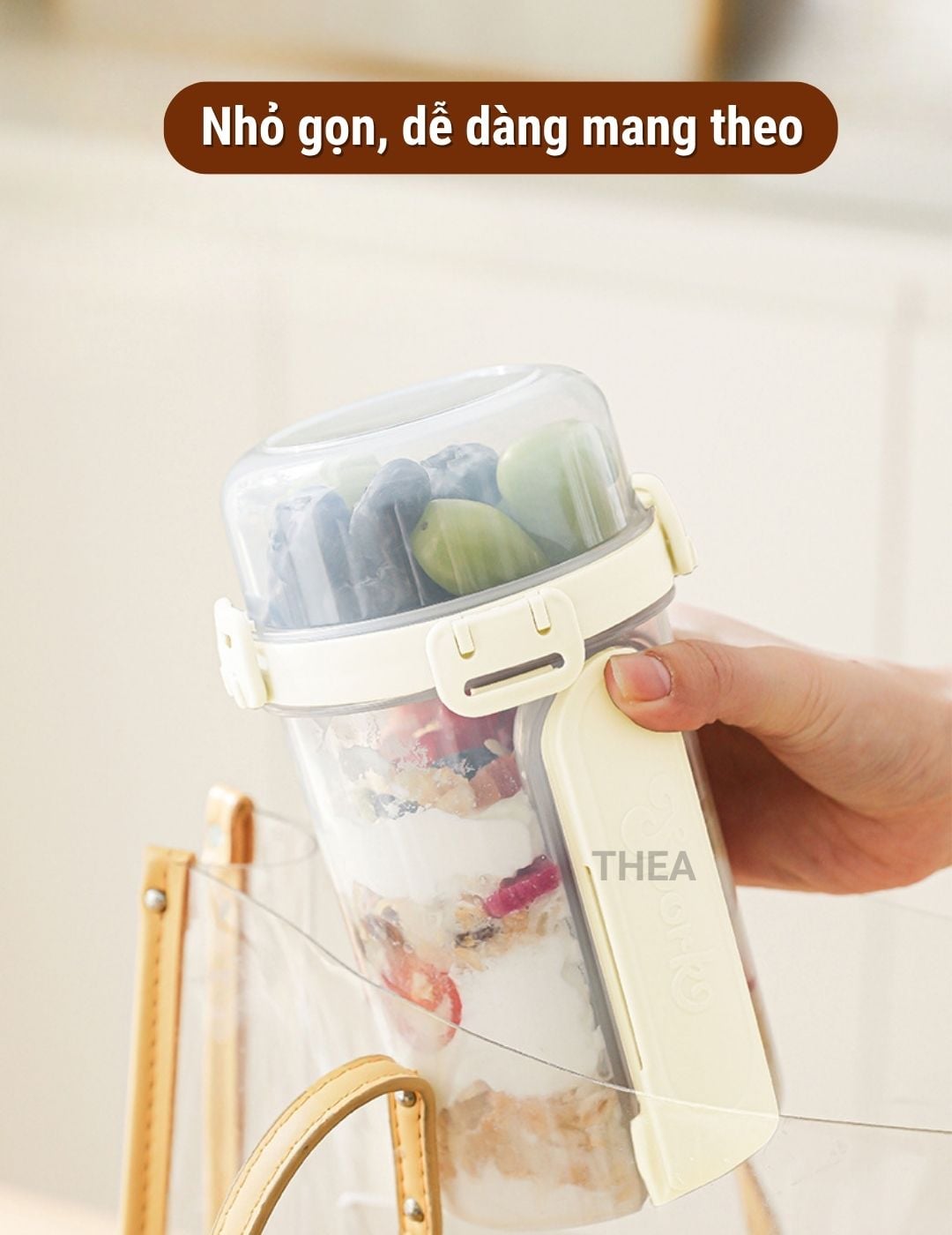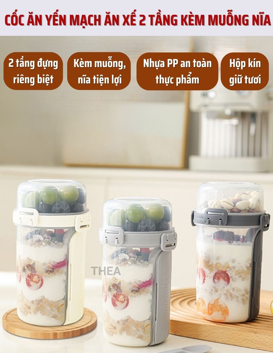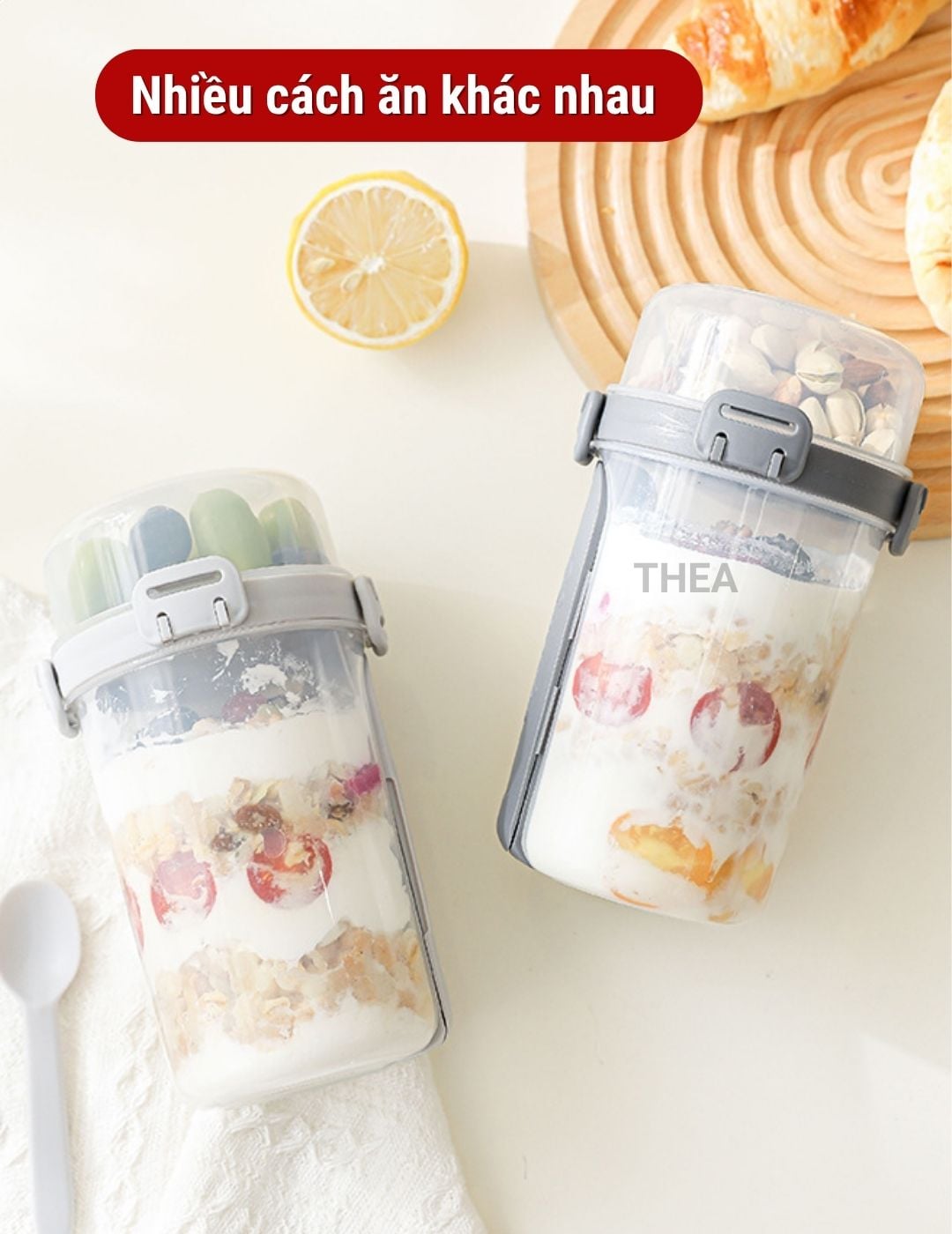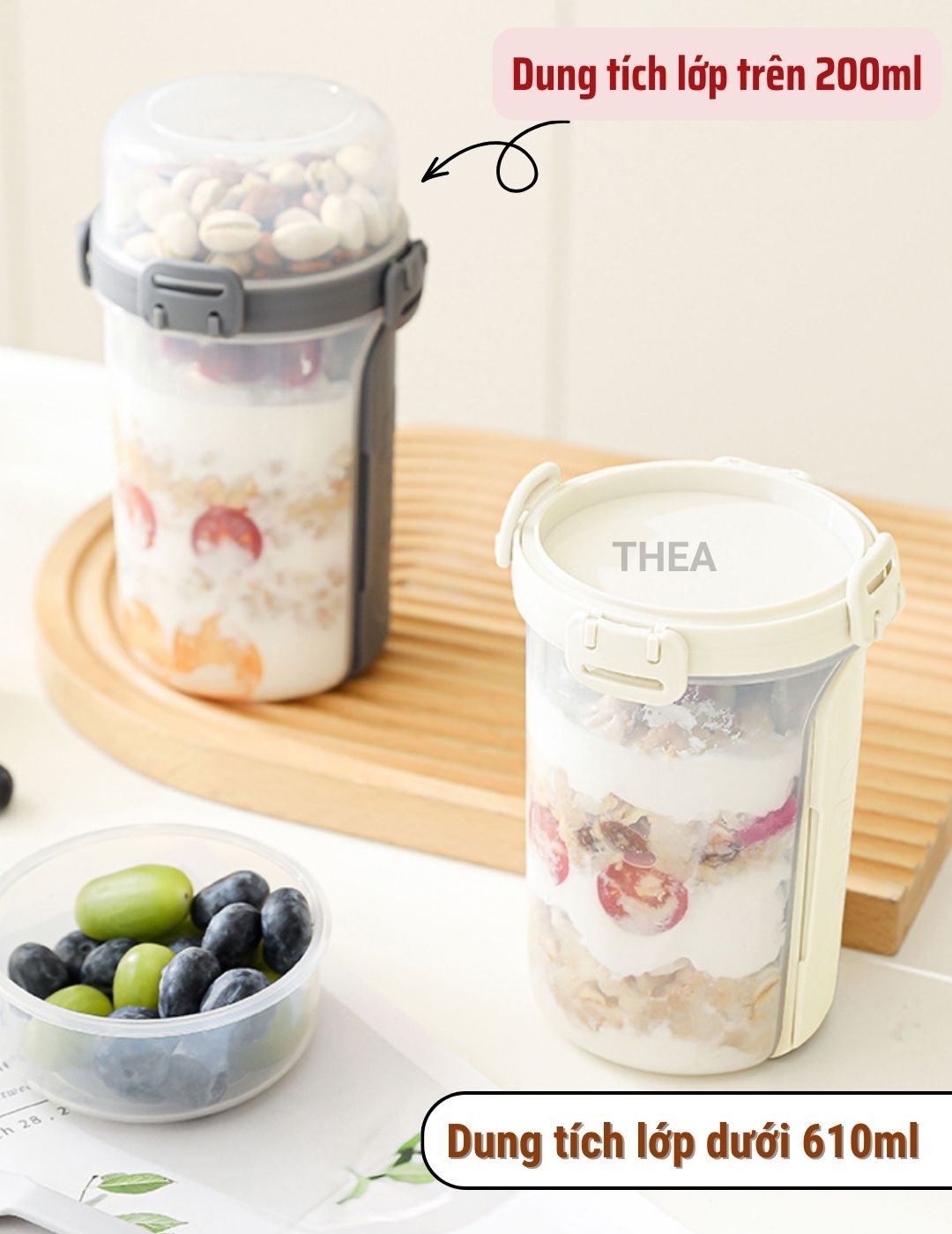 Hũ đựng yến mạch qua đêm, cốc nhựa trong có nắp ngâm yến mạch, Hộp đựng salad, hạt, ngũ cốc ăn sáng kèm muỗng nĩa 2 tầng - THEA