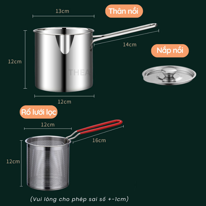 - Rổ đựng lưới lọc dầu: 14x14x13.5cm – tay cầm dài 16cm