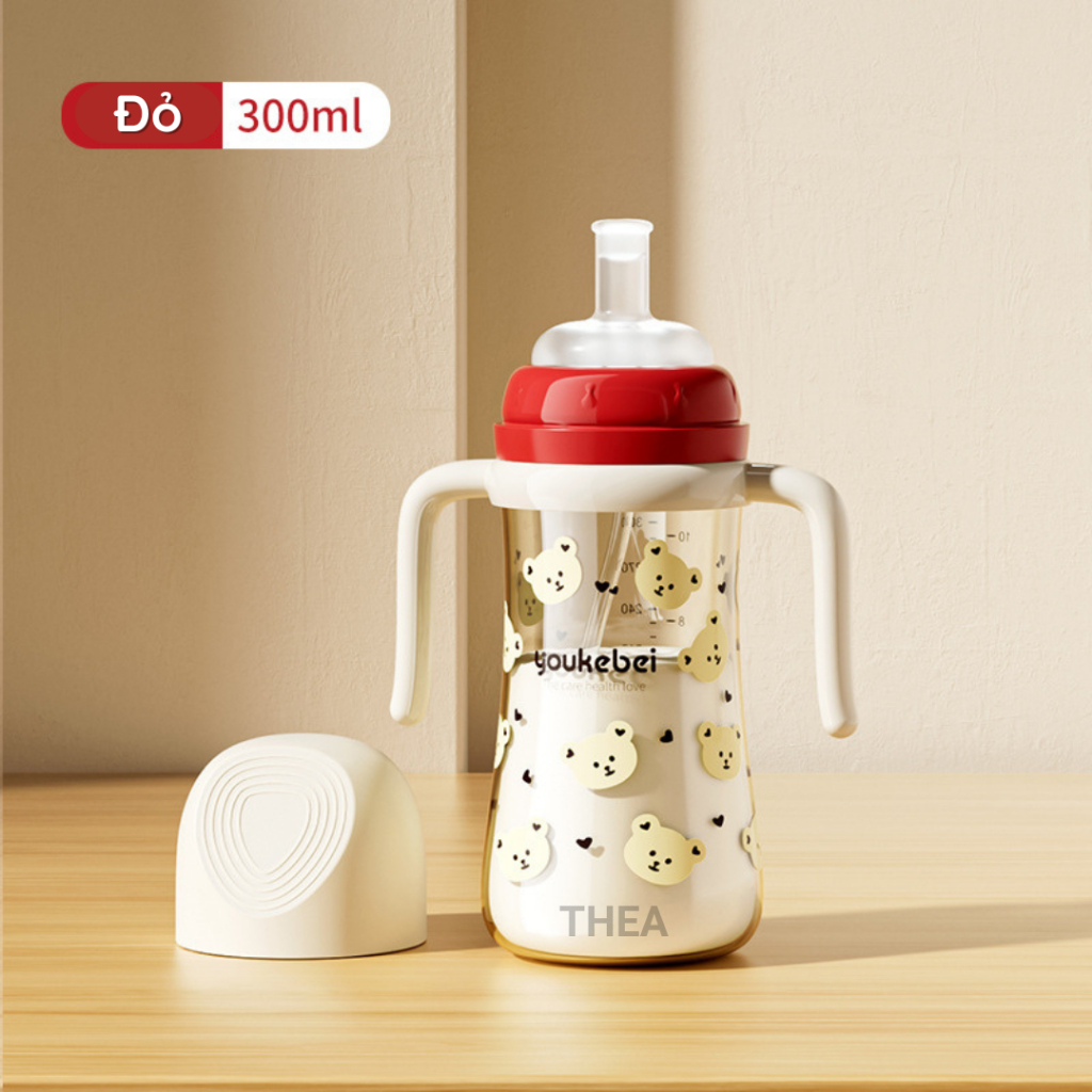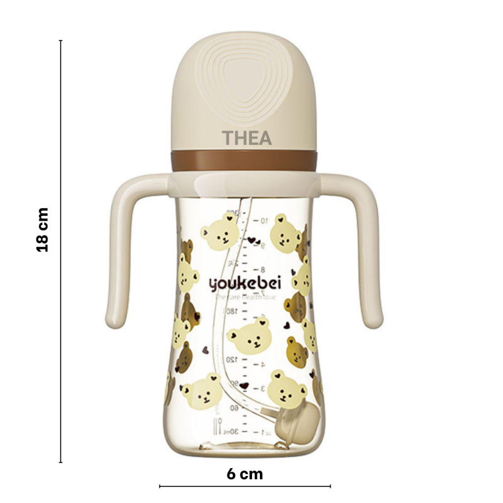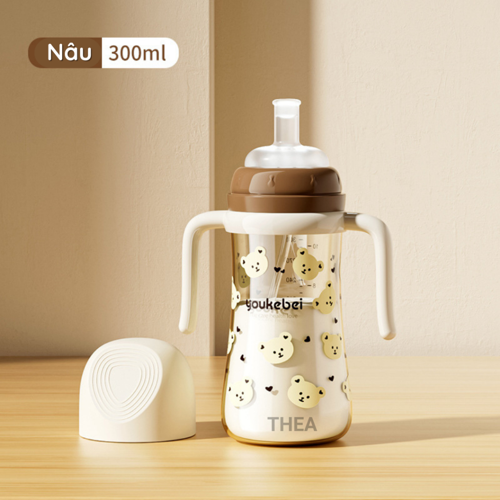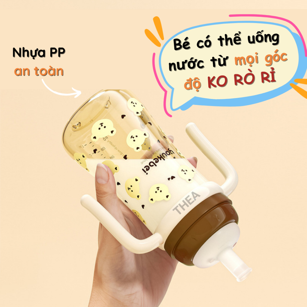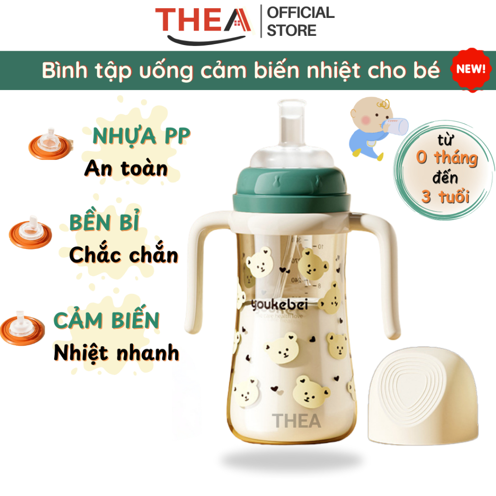 Bình tập hút uống sữa, nước chống sặc cho bé từ 6 tháng, 1-2-3 tuổi cảm biến nhiệt thông minh 300ml bằng nhựa PP cao cấp an toàn - THEA