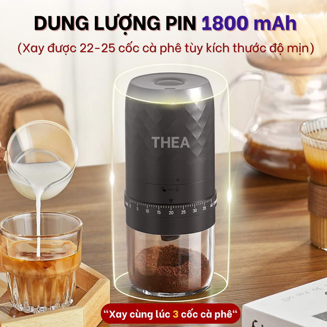 ☑️ Dung lượng pin 1800mAh, sử dụng lâu dài, có thể xay lên đến 25 cốc bột cà phê (tùy theo nhu cầu độ mịn bột).