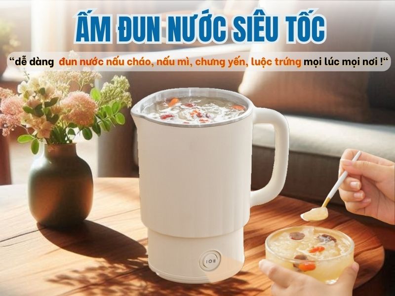 Chỉ cần sở hữu 1 chiếc ấm đun nước siêu tốc, bạn sẽ không còn lo lắng khi đi du lịch, công tác hay dã ngoại. Không chỉ đun nước siêu nhanh, bình đun siêu tốc mini còn đa năng hơn bạn nghĩ: nấu mì, pha trà, nấu cháo, chưng yến... Tất cả chỉ trong vài phút, nhỏ gọn nhưng cực kỳ tiện lợi!
