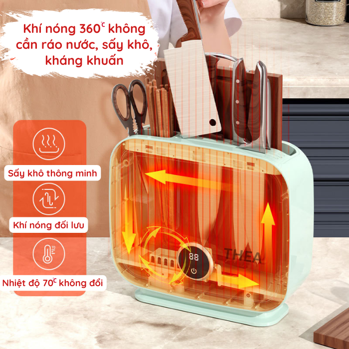 Một trong những điểm nổi bật của sản phẩm này là sử dụng tia cực tím (UV) để tiệt trùng. Khi thiết bị hoạt động, tia UV sẽ tiến hành diệt khuẩn và kích hoạt enzyme để phân hủy chất ô nhiễm. Với khả năng loại bỏ lên đến 99% giúp ngăn chặn sự lây lan của các loại vi khuẩn, vi rút… gần như tuyệt đối, trong quá trình sử dụng dao thớt đũa thìa.