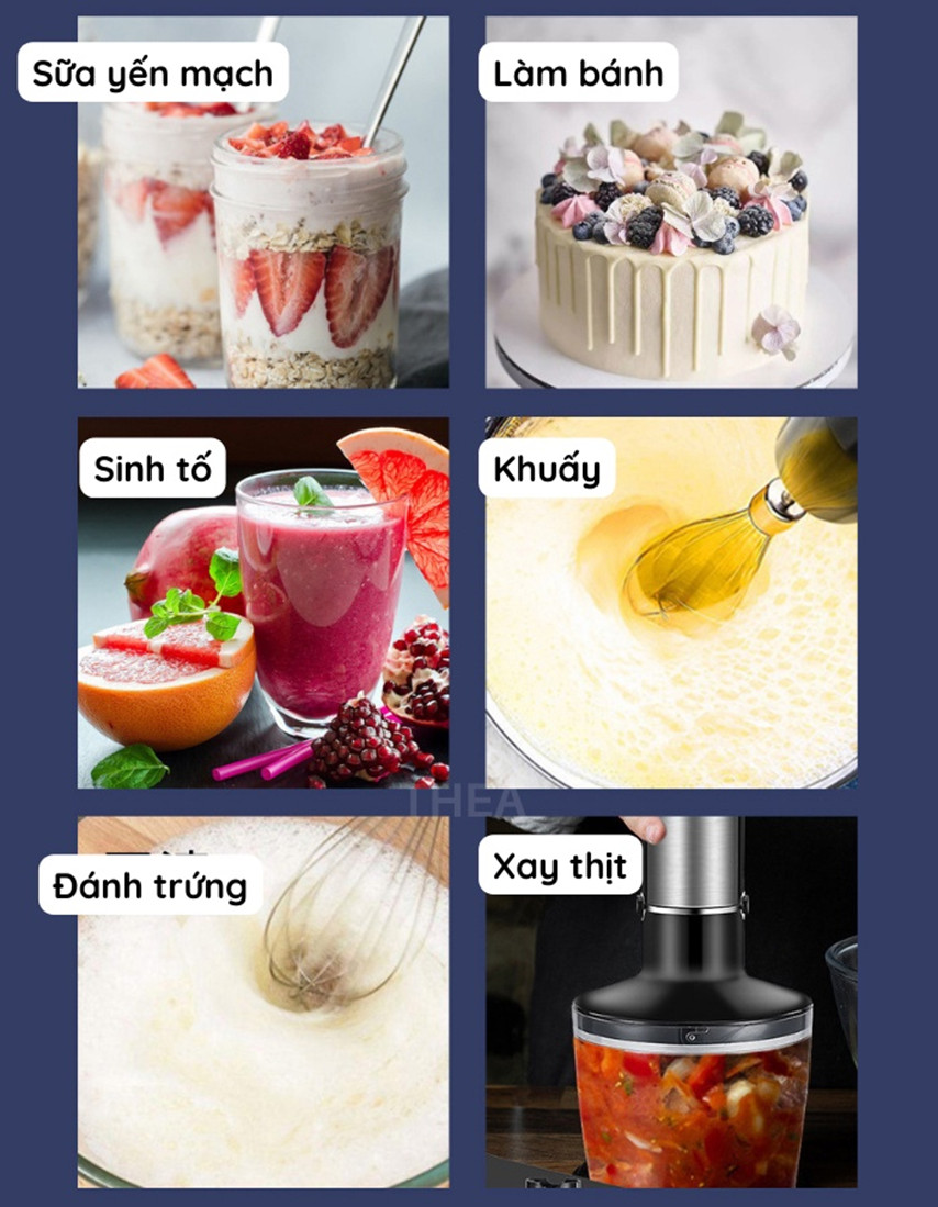 Máy xay sinh tố cầm tay đa năng mang lại sự tiện lợi đáng kể cho các bà nội trợ bằng cách kết hợp nhiều chức năng trong một thiết bị. Máy có thể dùng để xay sinh tố, ép nước trái cây, xay thịt, đánh trứng và xay ngũ cốc.