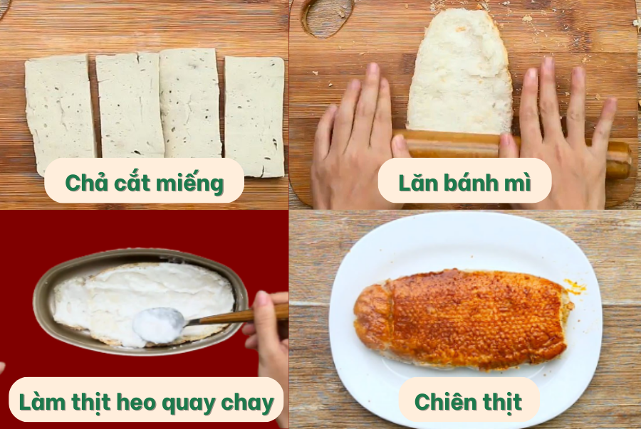 - Bánh mì: Cắt đôi theo chiều dọc và loại bỏ phần ruột, sau đó dùng chày cán dẹp bánh ra.